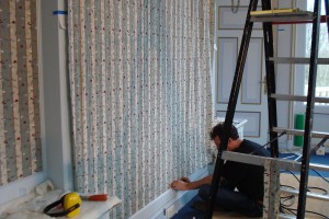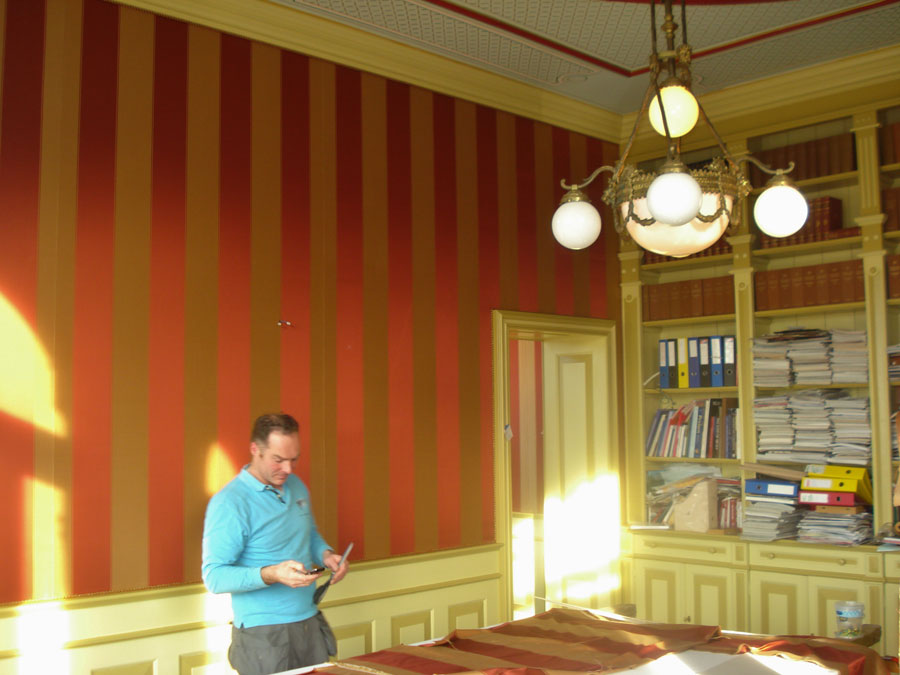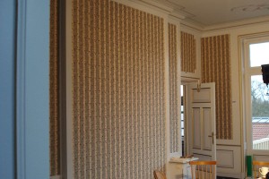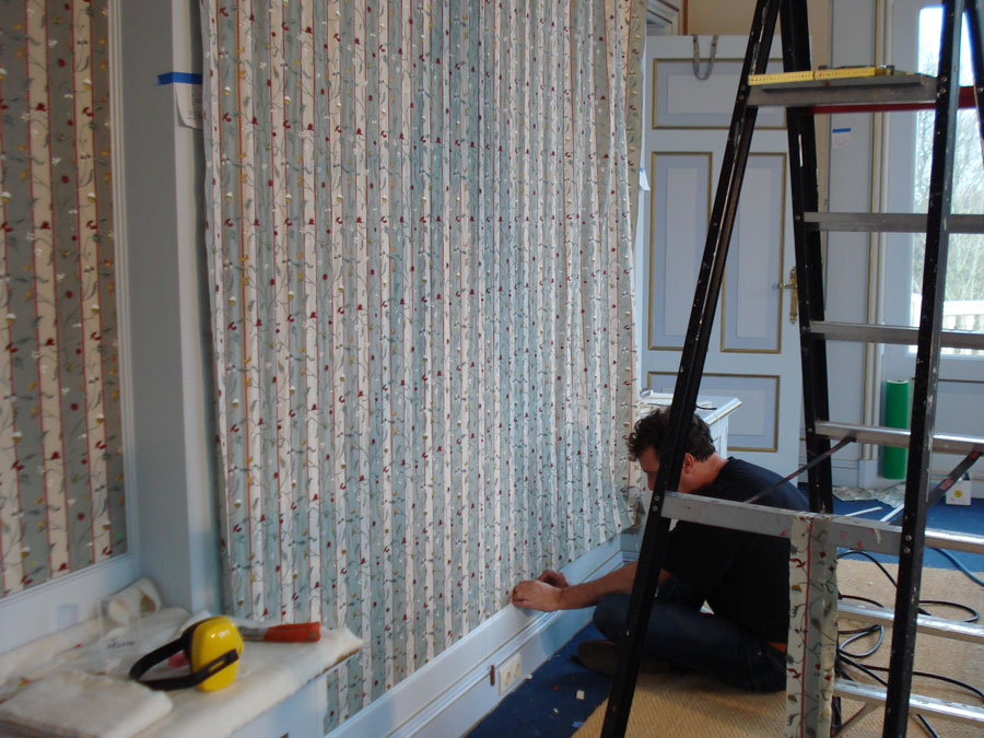 Na de stofkeuze wordt er een banen plan gemaakt hoe de banen op de wanden verdeeld gaan worden, indien er sprake is van een patroon wordt hier uiteraard rekening mee gehouden. De banen worden dan volgens plan in ons atelier aan elkaar gestikt en afgelockt.