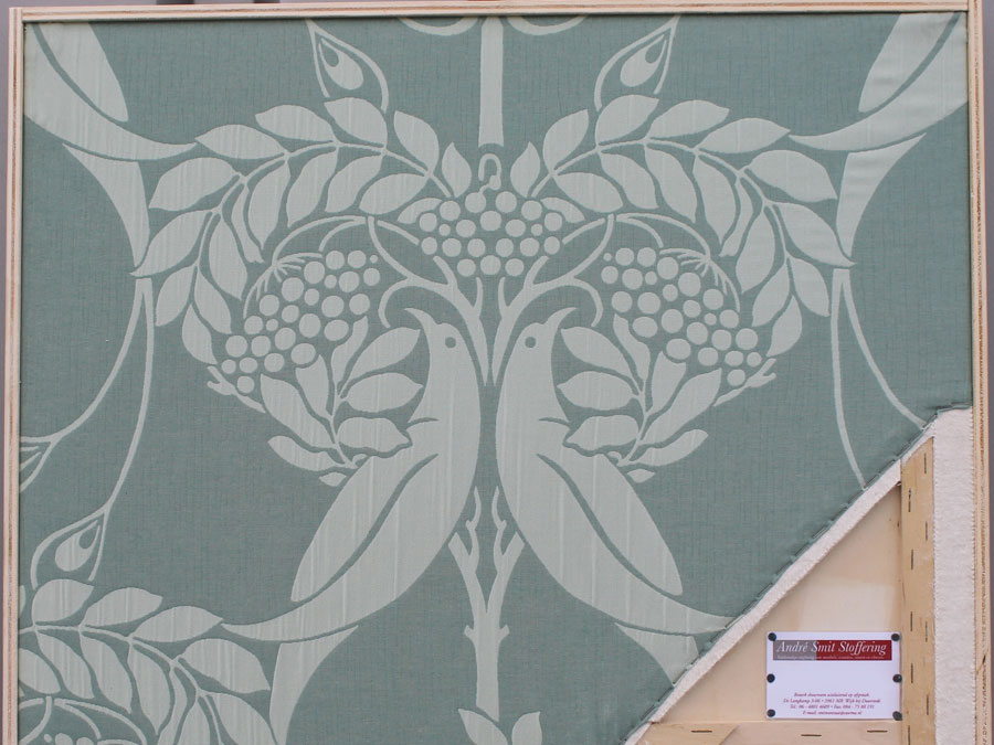 Door een uniek latten systeem kan op een molton onderlaag een strak van hoek tot hoek gespannen stoffen wand ontstaan. De plaatsen op de wand waar u iets wilt bevestigen, wordt door ons vooraf uitgevuld met meubelplaat achter de stof.